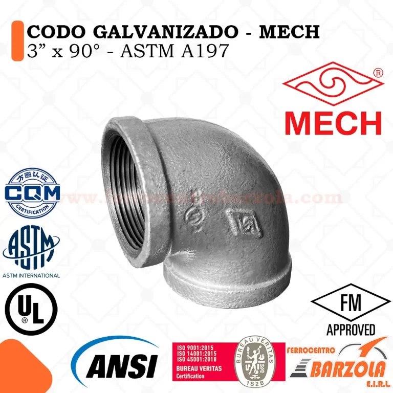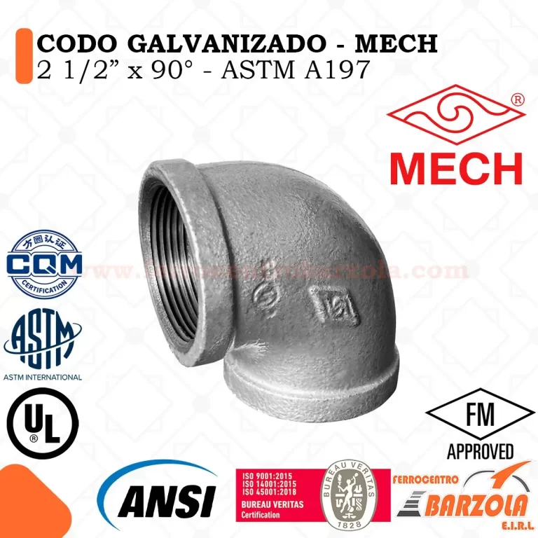 El Codo Galvanizado 90° MECH es un accesorio esencial para instalaciones hidráulicas, neumáticas y de gas, diseñado para realizar cambios de dirección en ángulo recto dentro del sistema de tuberías.