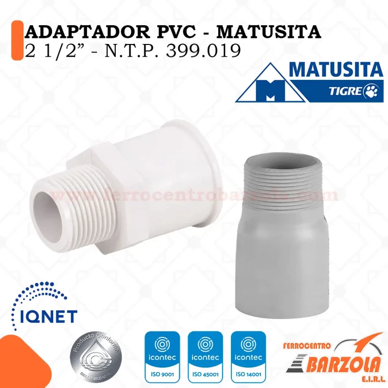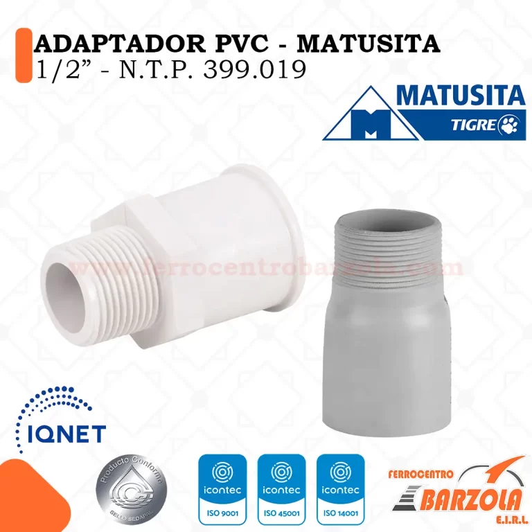 Compra el Adaptador PVC Matusita, fabricado en PVC de alta resistencia para conexiones seguras en sistemas de agua fría, presión y desagüe. Diseñado para unir tuberías y accesorios roscados o lisos, ofrece excelente durabilidad, resistencia a la corrosión y óptimo rendimiento hidráulico. Compatible con medidas estándar del mercado y fácil instalación con pegamento PVC o rosca. Ideal para proyectos residenciales y comerciales.