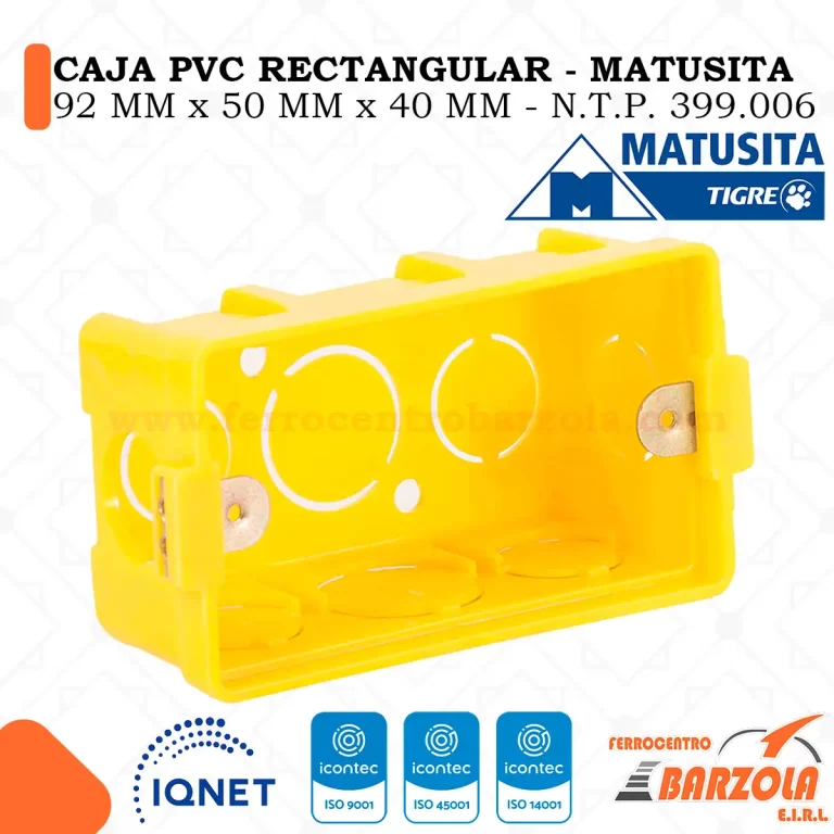 Compra la Caja Eléctrica Rectangular PVC 92mm x 50mm x 42mm Matusita, diseñada para instalaciones eléctricas empotradas en muros de concreto, ladrillo o drywall. Fabricada en PVC rígido de alta resistencia, ofrece excelente aislamiento eléctrico, propiedades autoextinguibles y resistencia a la humedad. Ideal para interruptores y tomacorrientes, con entradas troqueladas compatibles con tubería conduit. Cumple con NTP 399 y el Código Nacional de Electricidad.