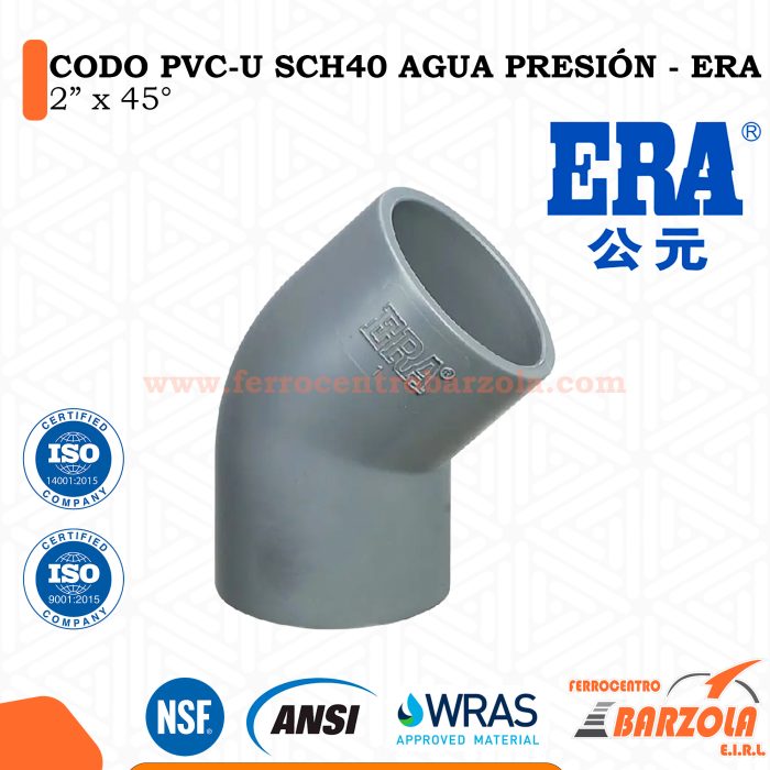 Codo PVC UF Inyectado 90 mm x 90° – ERA, fabricado en PVC-U de alta resistencia, ideal para redes de agua a presión. Su diseño inyectado y unión flexible aseguran una instalación rápida, hermética y duradera. Cumple normas internacionales, ofreciendo larga vida útil y excelente desempeño hidráulico.
