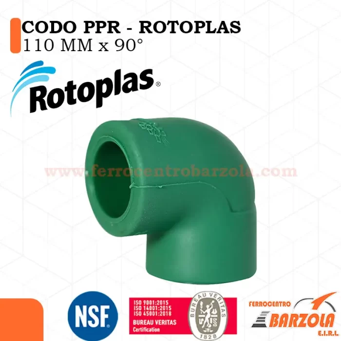 "Codo PPR 110 mm x 90° ROTOPLAS, ideal para desvíos en tuberías de agua fría o caliente. Resistente a altas presiones, termofusionable y con larga vida útil en instalaciones hidráulicas."