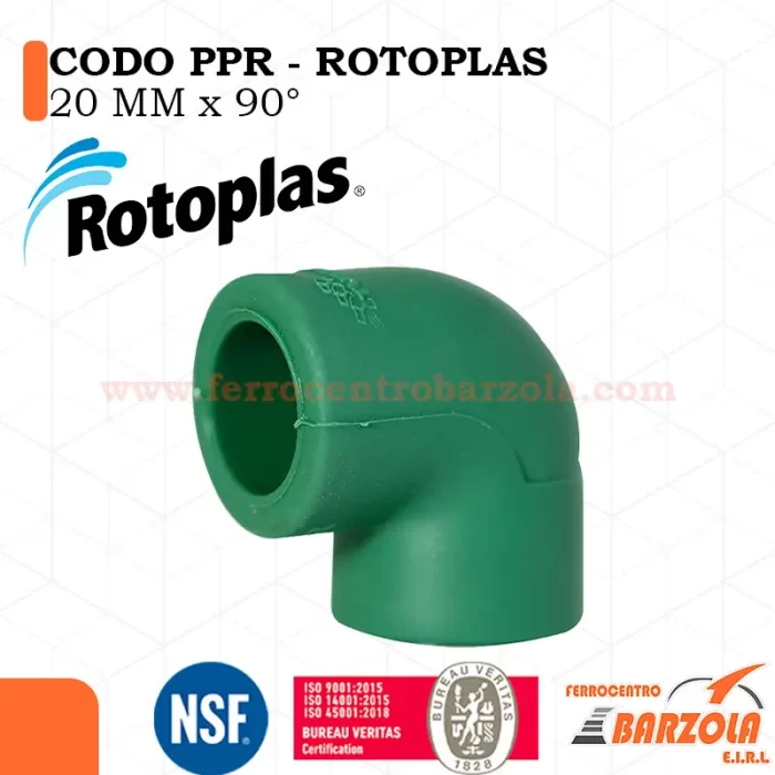 "Codo PPR 20 mm x 90° ROTOPLAS, ideal para desvíos en tuberías de agua fría o caliente. Resistente a altas presiones, termofusionable y con larga vida útil en instalaciones hidráulicas."