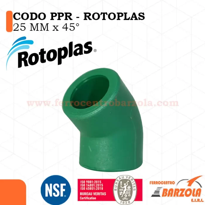"Codo PPR 25 mm x 45° ROTOPLAS, ideal para desvíos suaves en sistemas de agua potable. Alta resistencia a presión y temperatura, unión por termofusión, con capa antibacterial y protección UV"