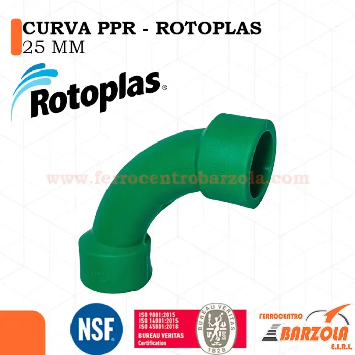 "La Curva PPR 25 mm x 90° de ROTOPLAS es ideal para redirigir el flujo en sistemas hidráulicos con eficiencia y seguridad. Su diseño resistente soporta altas presiones y temperaturas, incorpora unión por termofusión, protección UV para exteriores y una capa interna antibacterial que asegura la calidad del agua."