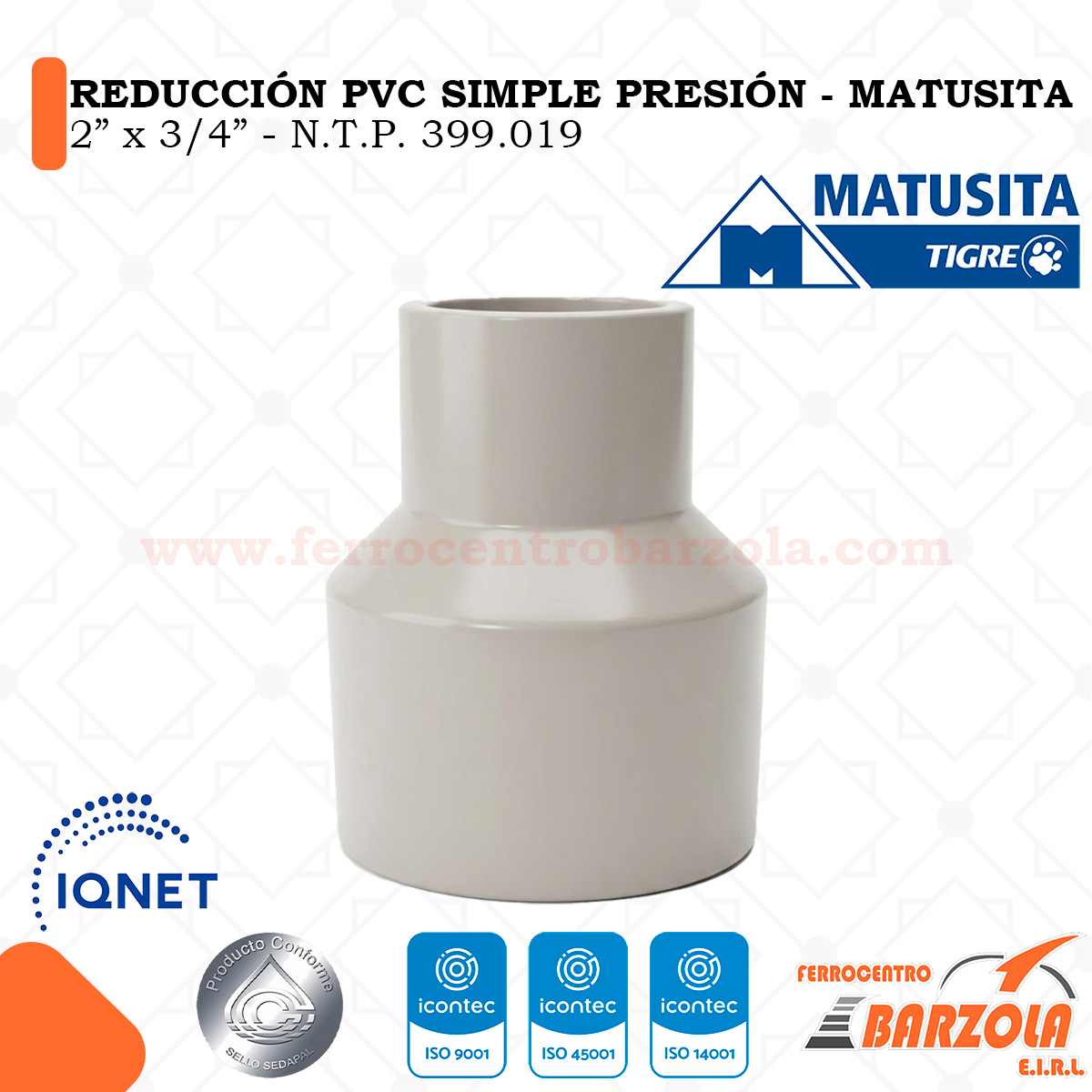 Compra la Reducción Simple Presión Matusita, diseñada para unir tuberías de diferente diámetro en sistemas de agua fría a presión. Fabricada en PVC de alta resistencia, ofrece excelente durabilidad, resistencia a la corrosión y sellado seguro mediante conexión de embone con pegamento PVC. Su interior liso optimiza el flujo y reduce pérdidas de carga. Compatible con medidas estándar del mercado, ideal para proyectos residenciales y comerciales.