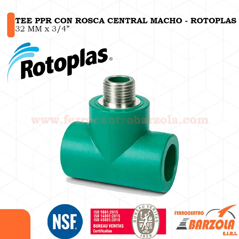 «Tee PPR con Rosca Macho 32 mm x 3/4» ROTOPLAS, diseñada para integrar sistemas hidráulicos plásticos con accesorios metálicos. Ofrece unión segura por termofusión, alta resistencia mecánica y térmica, además de capa antibacterial y protección UV para uso interior o exterior.»