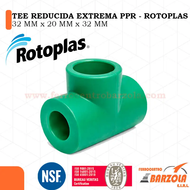 «Tee PPR Reducida Extrema 32 x 20 x 32 mm ROTOPLAS, ideal para derivaciones en instalaciones hidráulicas. Unión por termofusión, alta resistencia a presión y temperatura, con capa antibacterial y protección UV.»