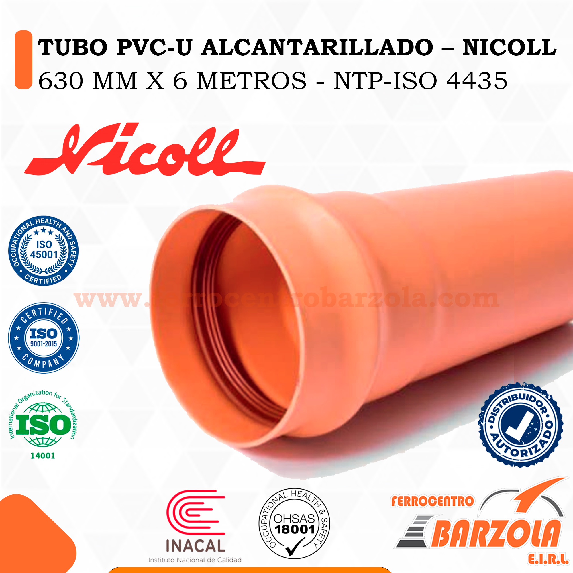 Tubo PVC-U Alcantarillado 630 mm x 6 m – NTP ISO 4435 – NICOLL