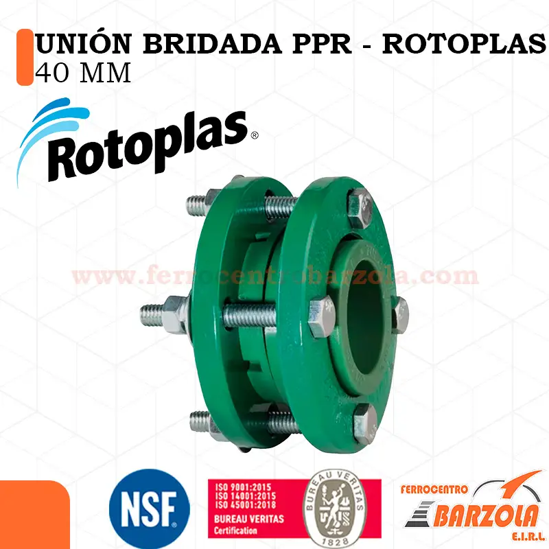 Unión Bridada PPR marca Rotoplas, diseñada para conectar tuberías PPR a válvulas, bombas y equipos con sistema de brida. Fabricada en polipropileno random de alta calidad, ofrece resistencia a presión, temperatura y corrosión. Su unión por termofusión garantiza sellado hermético y larga vida útil. Ideal para instalaciones residenciales, comerciales e industriales que requieren máxima seguridad y rendimiento hidráulico.