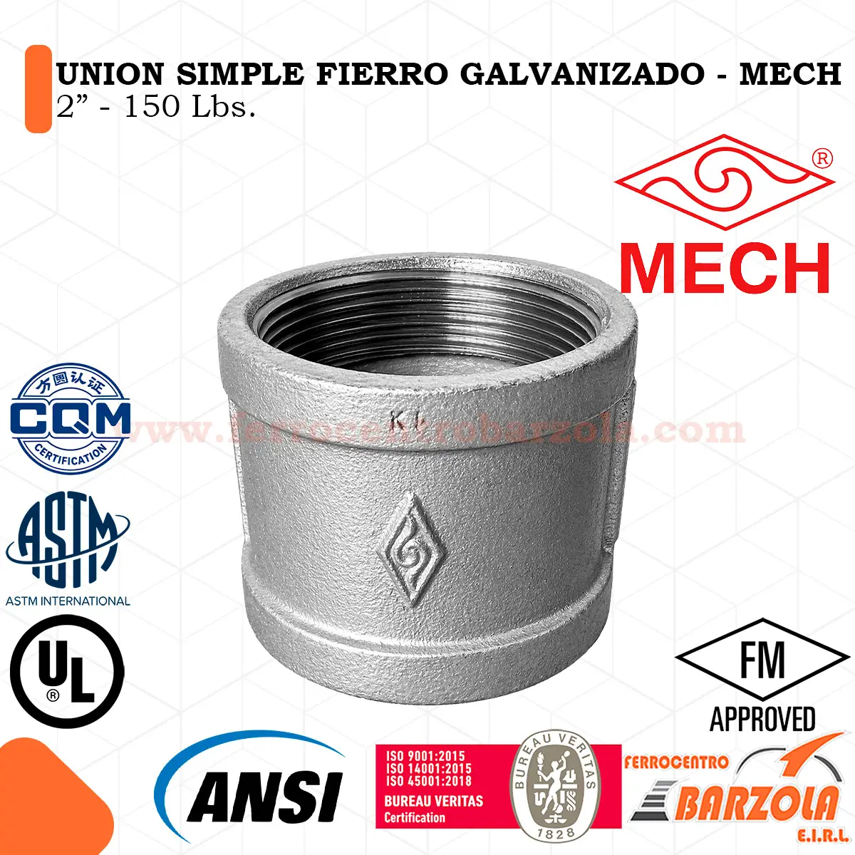 La Unión Simple de Fierro Galvanizado 150 libras MECH es un accesorio diseñado para unir dos tramos de tubería de manera firme y segura dentro de sistemas hidráulicos, neumáticos y de gas.