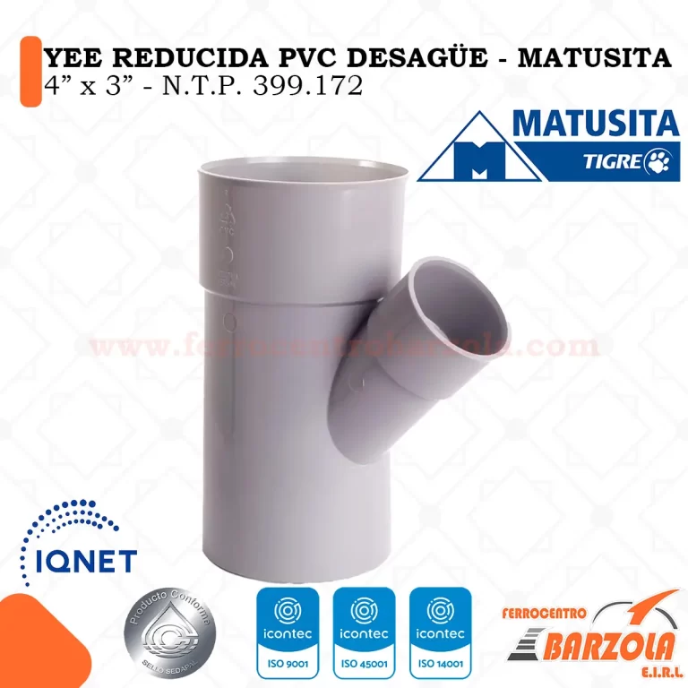La YEE con Reducción PVC Desagüe Matusita es un accesorio sanitario diseñado para realizar derivaciones en sistemas de drenaje conectando tuberías de distintos diámetros. Su diseño en “Y” mejora el flujo de aguas residuales y reduce el riesgo de obstrucciones. Fabricada en PVC de alta resistencia, soporta humedad, corrosión y agentes químicos. Ideal para instalaciones sanitarias residenciales, comerciales e industriales con instalación rápida mediante pegamento PVC.